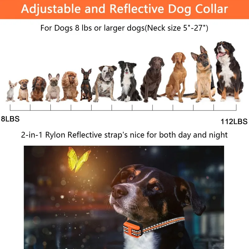 Adjustable Collar-Our dog training collars are adjustable in length from 8 to 27 inches long, suitable for dogs of all sizes from 10 to 110 pounds. The dog collar strap is made of durable marterial with a reflective design, suitable for day and night, indoor and outdoor use.